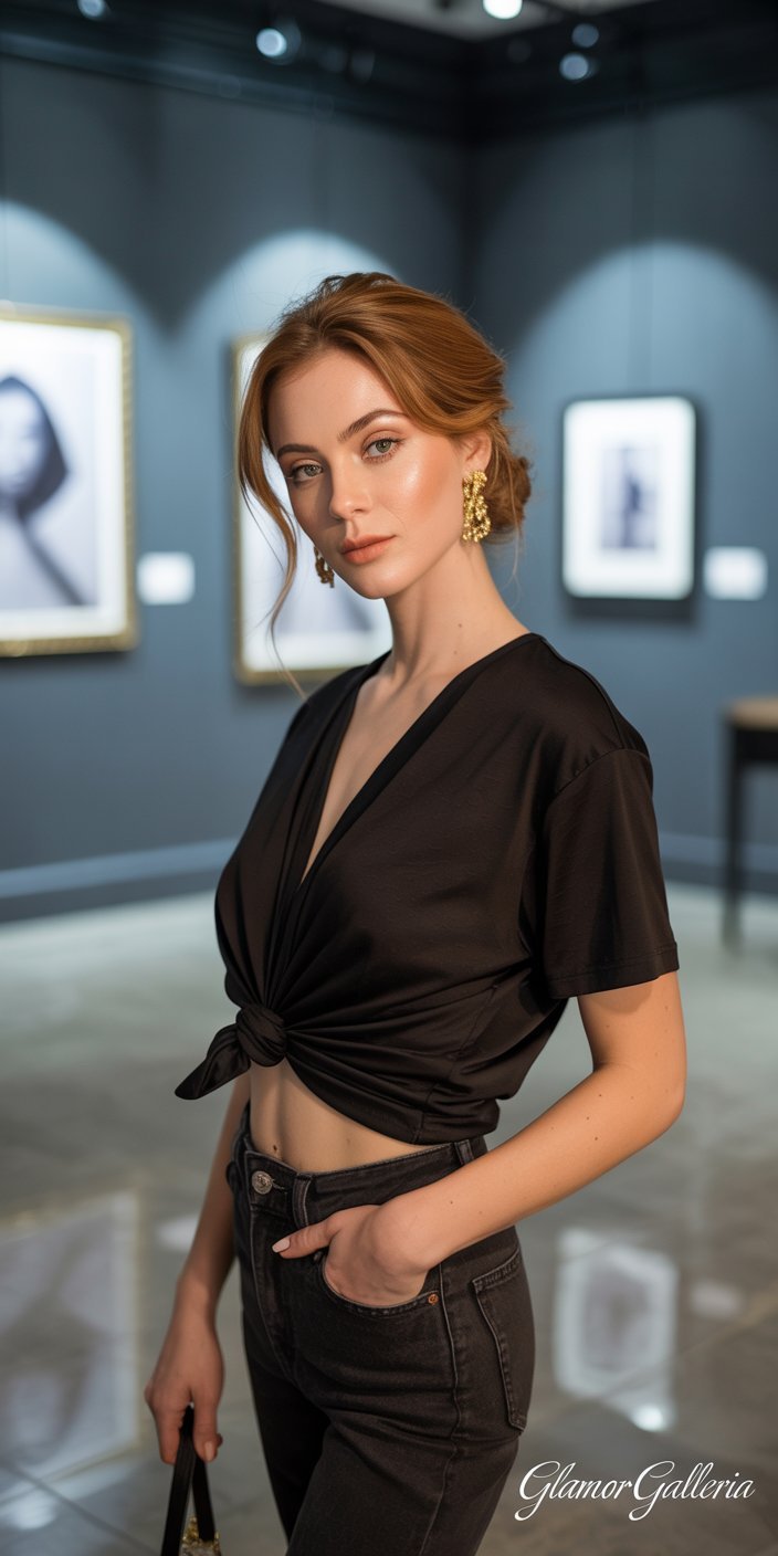- Night: Knot at the waist over high-waist jeans with statement earrings.