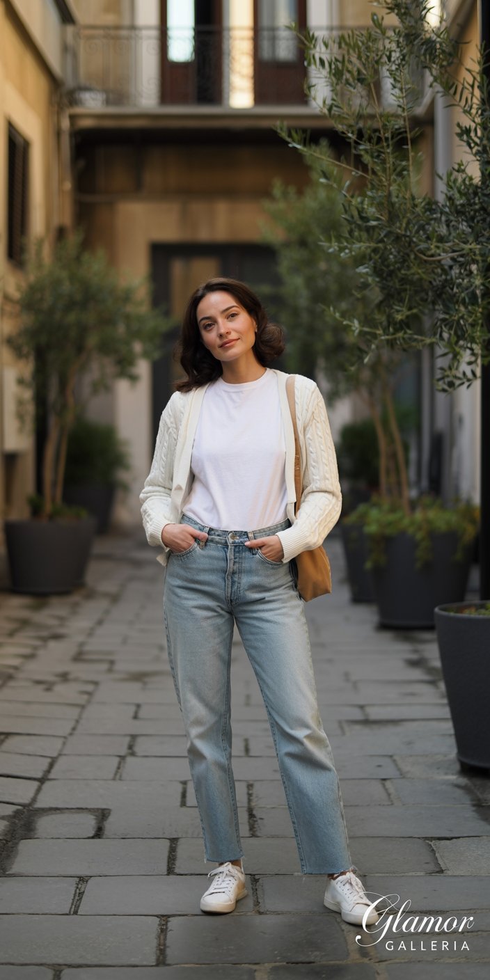 - Light-wash denim + ivory cable-knit sweater