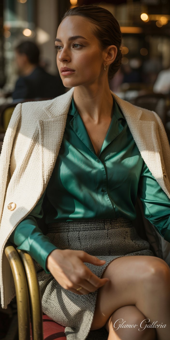 - Plaid Wool Pants + Silk Blouse: Autumn-ready with structure and sheen.