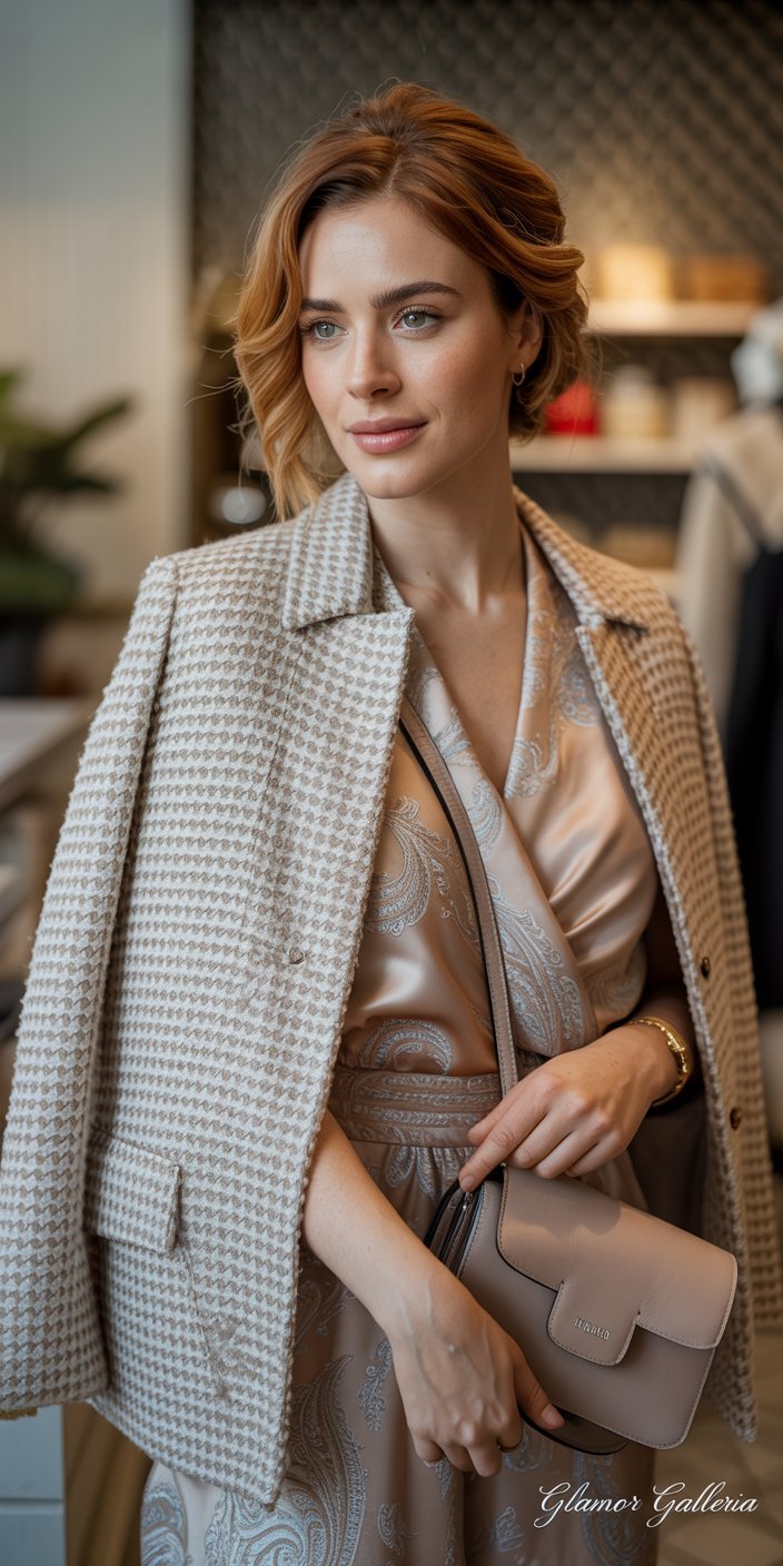- Idea: Fuse a textured print (bouclé houndstooth) with a smooth print (silk paisley).