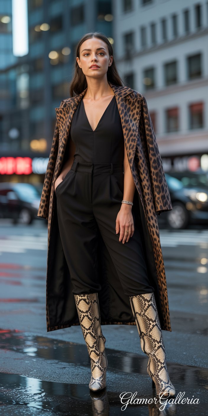 - Idea: Offset a printed outfit with an equally bold printed accessory—snake-print boots with leopard-print coat.