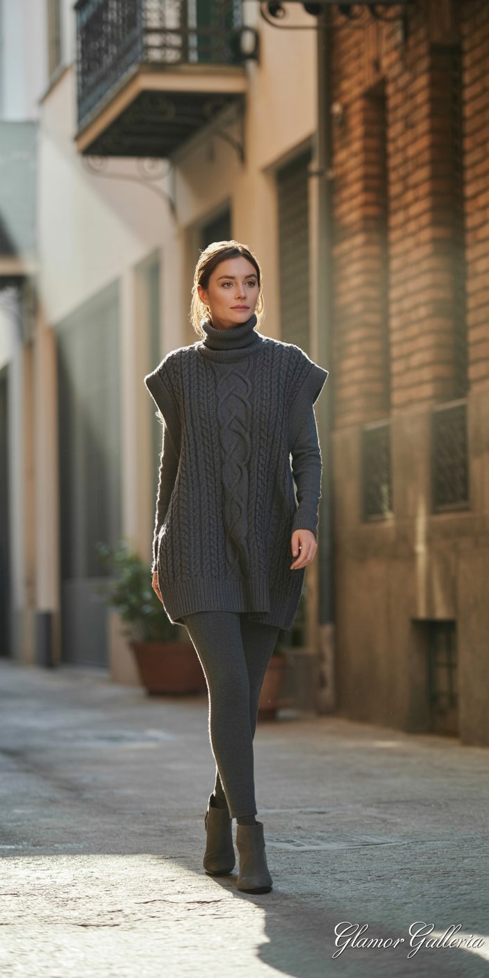 Why it works: Each knit reflects light differently, so the eye registers depth even though everything is technically “charcoal.”
