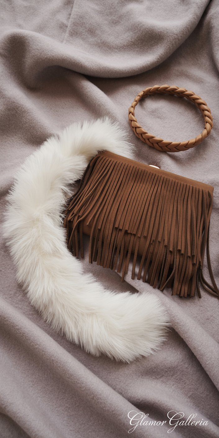 - Fringe: suede belt or clutch with delicate fringe sways and contrasts against flat fabrics.