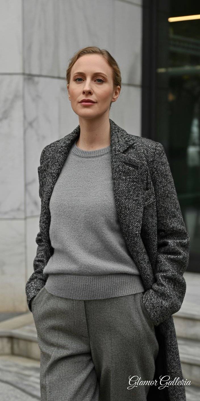 Styling idea: Throw a salt-and-pepper gray tweed coat over dove-gray cashmere and stone-gray wool trousers for a gradient-yet-monochrome moment.