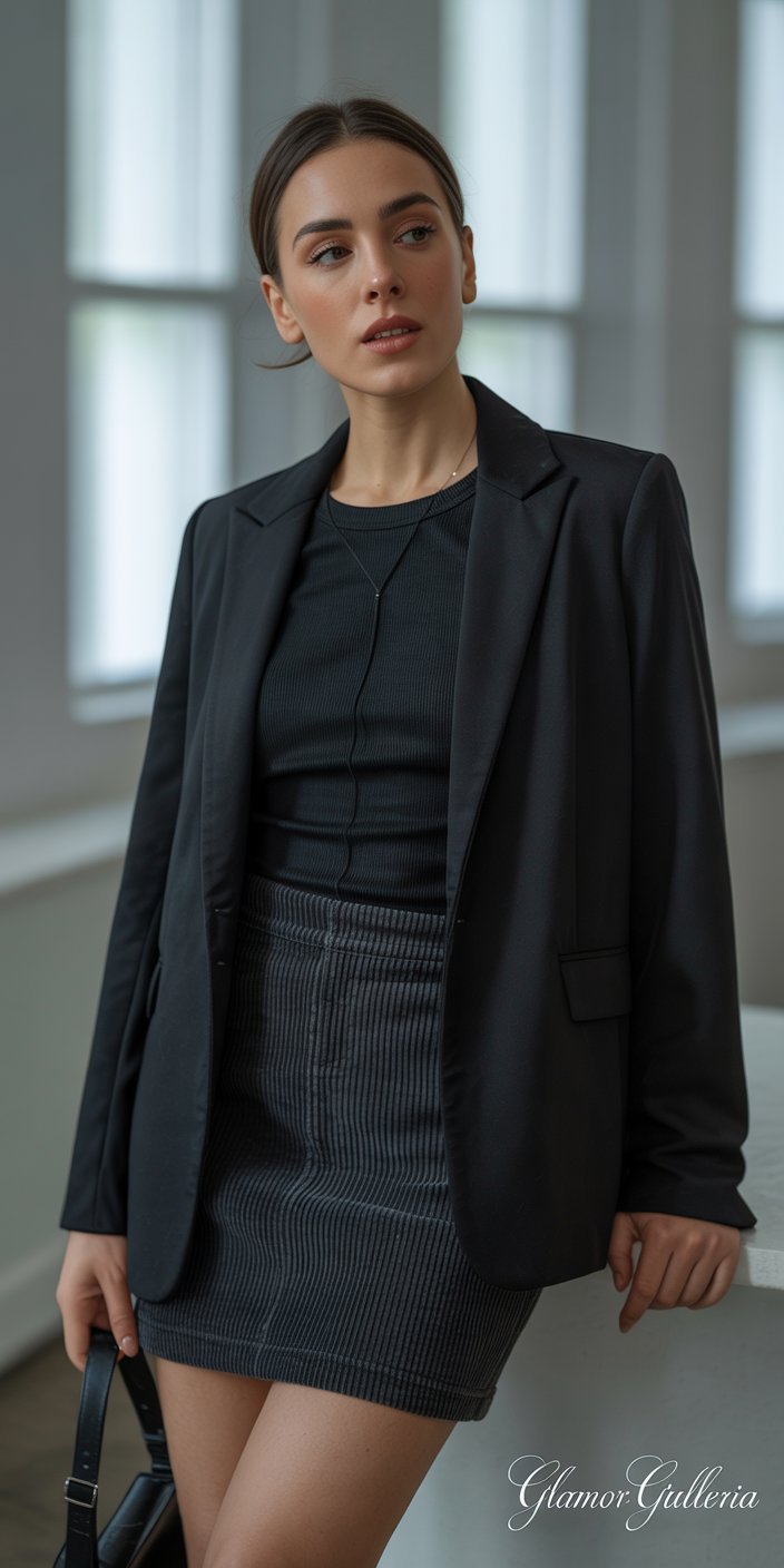Three-piece equation: ribbed tee + smooth ponte blazer + cord mini. Because the rib and cord share a vertical orientation, the look feels intentional.