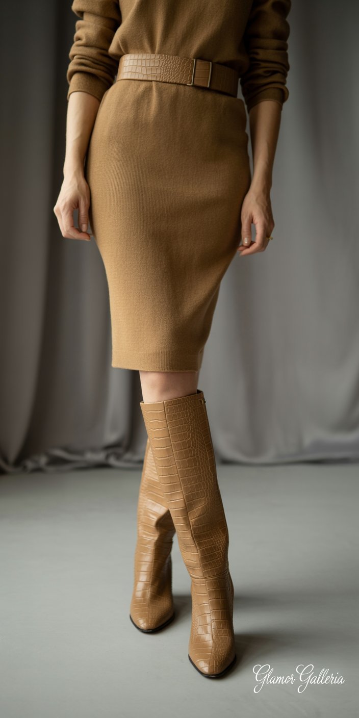 - Monochrome camel look: knit midi + croc-embossed knee boots.